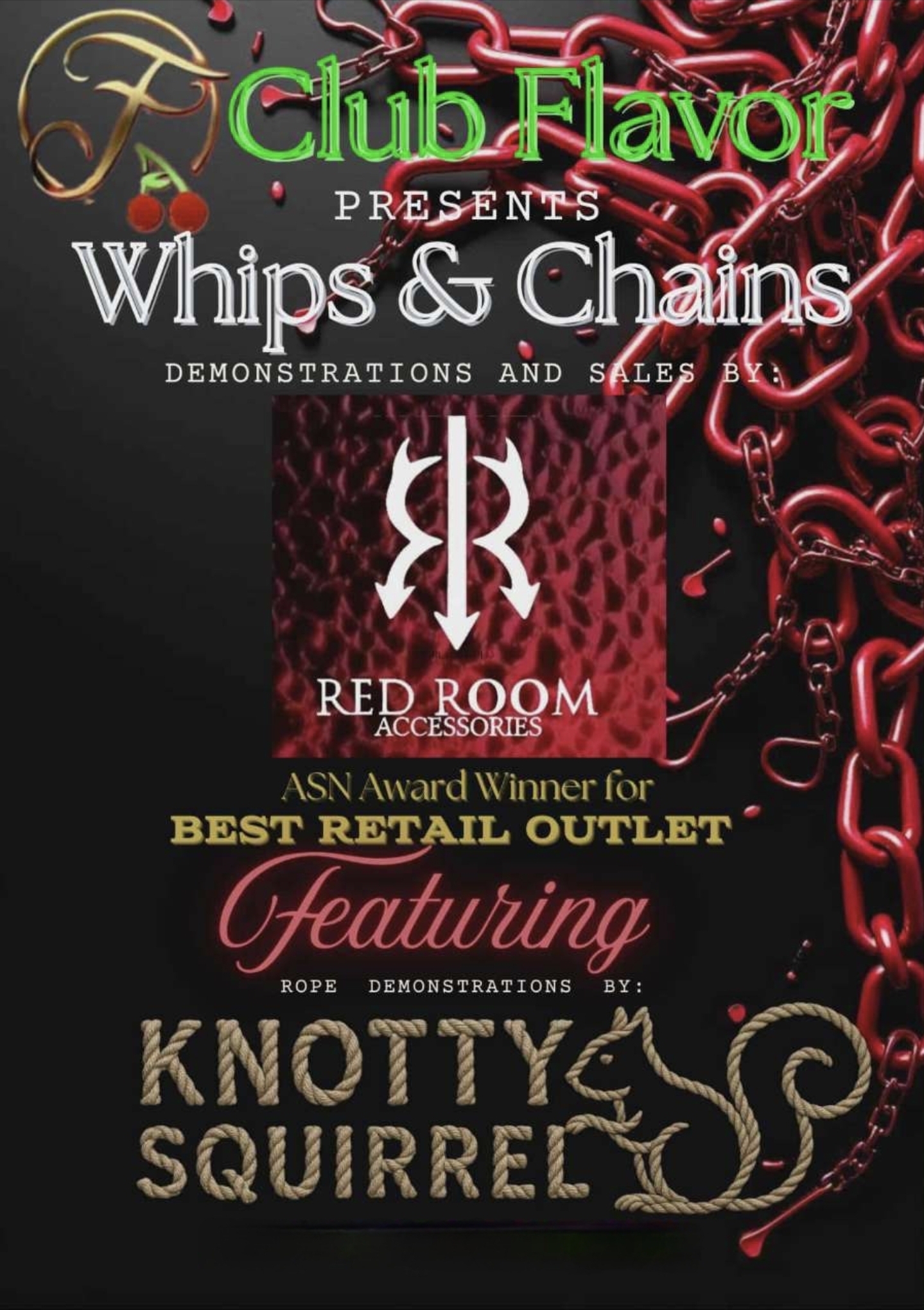 Red Room Accessories will be in the house so come check out their items, get information or even purchase one of their high quality floggers.